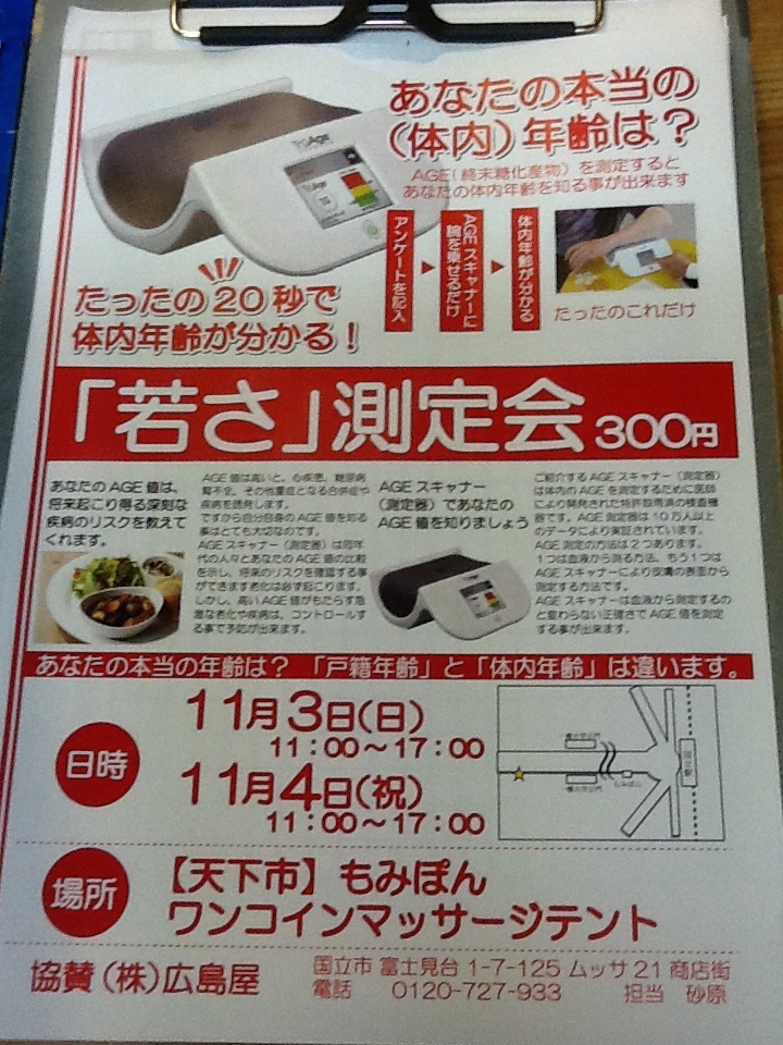 今年は 「ワンコインマッサージ」10分500円 「ハーブティ販売」10pk入り1箱300円 に加えて、3日 4日 限定ですが「体内年齢測定会」を開催します。 機器に腕をのせるだけで20秒くらいで体内年齢が計測されます。 計測機器や予備知識についてはこちら ↓↓↓ AGE(終末糖化産物)とは? ちなみに店長が計測したら結果は「実年齢+2歳」でした。 協賛) (株)広島屋